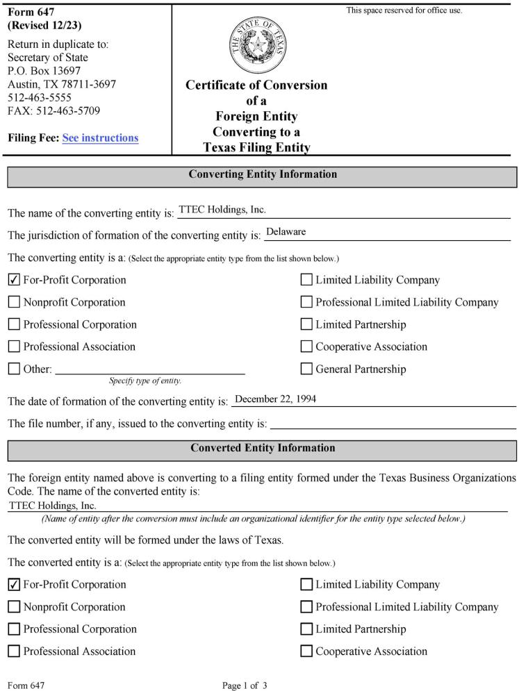 | Signature [PLEASE SIGN WITHIN BOX] Date Signature (Joint Owners) Date TO VOTE, MARK BLOCKS BELOW IN BLUE OR BLACK INK AS FOLLOWS: KEEP THIS PORTION FOR YOUR RECORDS DETACH AND RETURN THIS PORTION ONLY THIS PROXY CARD IS VALID ONLY WHEN SIGNED AND DATED. PRELIMINARY PROXY CARD – SUBJECT TO COMPLETION V87030-P51454 For Against Abstain ! ! ! ! ! ! ! ! ! ! ! ! ! ! ! ! ! ! ! ! 100 CONGRESS AVENUE, SUITE 1425 AUSTIN, TX 78701 VOTE BY INTERNET Before The Meeting - Go to www.proxyvote.com or scan the QR Barcode above Use the Internet to transmit your voting instructions and for electronic delivery of information up until 11:59 p.m., Eastern Daylight Time, on May 20, 2026. Have your proxy card in hand when you access the website and follow the instructions to obtain your records and to create an electronic voting instruction form. During The Meeting - Go to www.virtualshareholdermeeting.com/TTEC2026 You may attend the meeting via the Internet and vote during the meeting. Have the information that is printed in the box marked by the arrow available and follow the instructions. VOTE BY PHONE - 1-800-690-6903 Use any touch-tone telephone to transmit your voting instructions up until 11:59 p.m., Eastern Daylight Time, on May 20, 2026. Have your proxy card in hand when you call and then follow the instructions. VOTE BY MAIL Mark, sign and date your proxy card and return it in the postage-paid envelope we have provided or return it to Vote Processing, c/o Broadridge, 51 Mercedes Way, Edgewood, NY 11717. TTEC HOLDINGS, INC. 1. Election of Director Nominees The Board of Directors recommends you vote FOR the following: 1a. Kenneth D. Tuchman 1b. Steven J. Anenen 1c. Tracy L. Bahl 1d. Gregory A. Conley 1e. Robert N. Frerichs 1f. Marc L. Holtzman 1g. Gina L. Loften For Withhold NOTE: This proxy, when properly executed, will be voted in the manner directed herein. If no direction is made, the proxy will be voted FOR all of the Board of Directors' nominees and FOR Proposals 2, 3 and 4. NOTE: Such other business as may properly come before the meeting or any adjournment thereof. 2. The ratification of the appointment of PricewaterhouseCoopers LLP as our independent registered public accounting firm for fiscal year 2026. 3. The approval, on a non-binding, advisory basis, of the compensation of our named executive officers, as disclosed in the Proxy Statement. 4. The approval of the redomestication of the Company from Delaware to Texas by conversion. Please sign exactly as your name(s) appear(s) hereon. When signing as attorney, executor, administrator, or other fiduciary, please give full title as such. Joint owners should each sign personally. All holders must sign. If a corporation or partnership, please sign in full corporate or partnership name by authorized officer. ! ! ! SCAN TO VIEW MATERIALS & VOTEw |