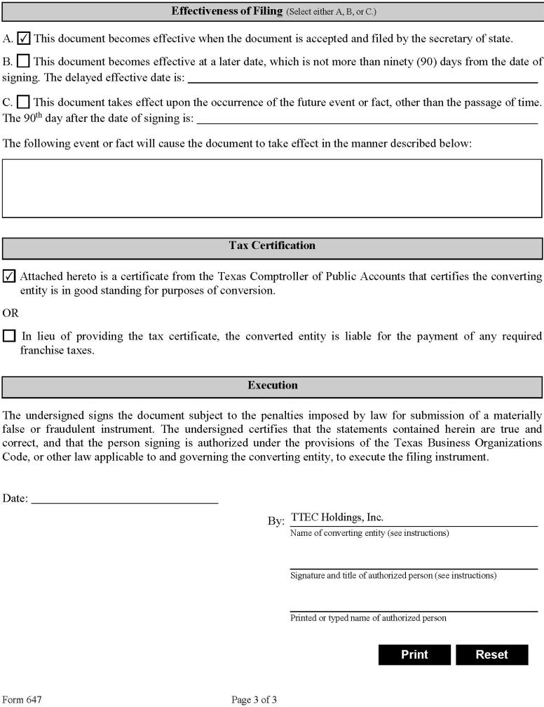 4. Governance of the Converted Entity. On and after the Effective Time, the affairs of the Converted Entity shall be governed in accordance with the TBOC and the Certificate of Formation, and the Bylaws of the Converted Entity in substantially the form attached hereto as Exhibit B. Immediately after the Effective Time, the directors and officers of the Converting Entity shall continue as the directors and officers of the Converted Entity.