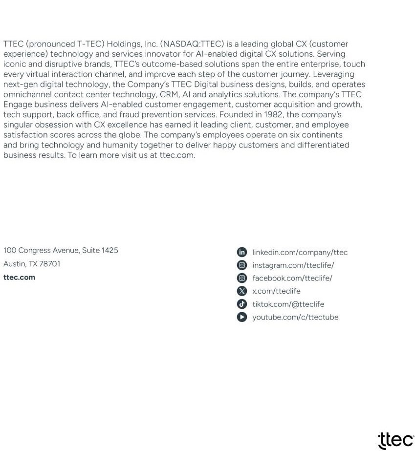 This summary highlights only selected information contained in this Proxy Statement. We encourage you to read the entire Proxy Statement and TTEC’s 2025 Annual Report on Form 10-K for the period ended December 31, 2025, and any subsequent financial filings, before voting your shares.